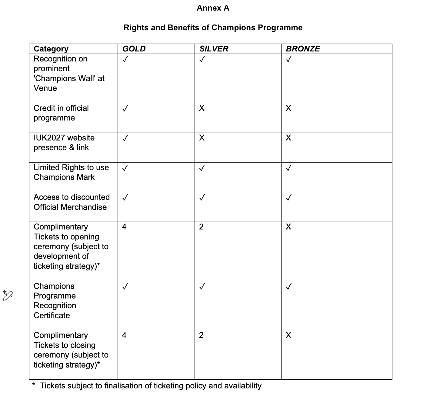 2.1 By completing the online form and submitting payment of the relevant licence fee, you are applying to become a Bronze, Silver or Gold Champion of IUK2027, and agree to abide by these Terms.